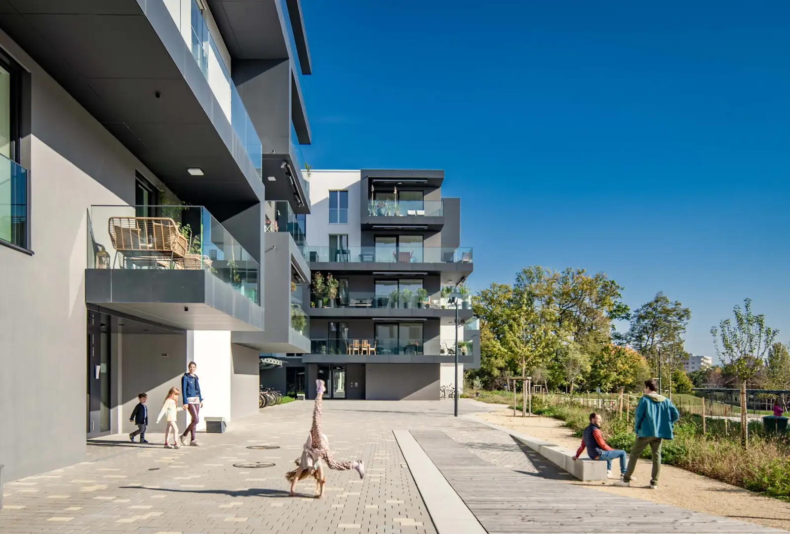 Situé au cœur de la région viticole de la Côte, à deux pas du centre-ville de Morges, le quartier durable Eglantine offre une agréable sensation de vivre entre ville et campagne. Outre des espaces extérieurs conçus dans le respect de la biodiversité – aménagement de noues paysagères, création d’un jardin potager ou encore présence d’un parc central comme zone de verdure et de dégagement – le quartier encourage la mobilité douce. Ainsi, ses habitantes et habitants bénéficient de parkings à vélos de 1000 places, de plusieurs chemins piétonniers et de trottinettes électriques.
